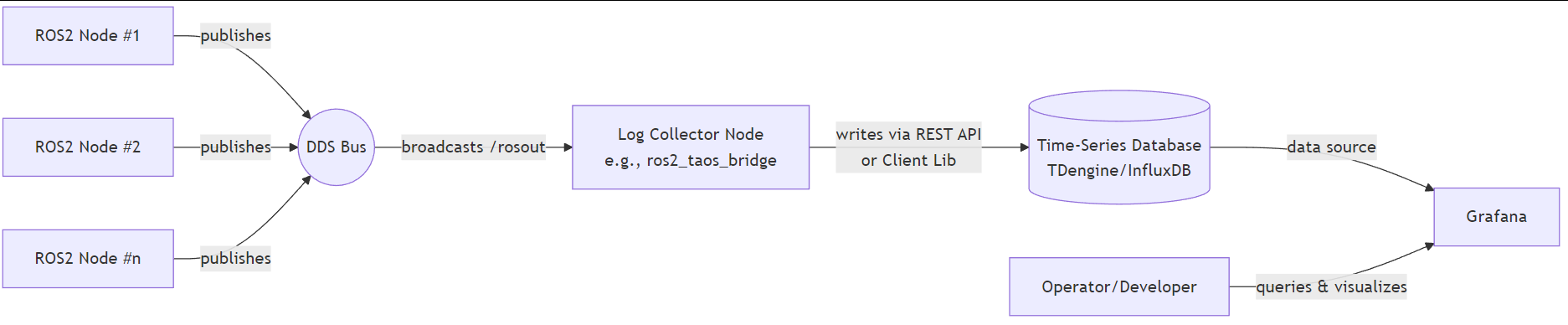 时序数据库是专门为处理时间序列数据而优化的数据库。时间序列数据是按时间索引的一系列数据点。ROS2的每一条日志都天然带有一个高精度时间戳,完美符合时序数据的定义。