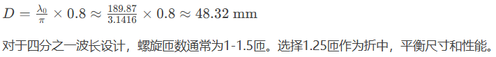 螺旋直径直接影响天线的辐射特性。较大的直径可以增加带宽,但也会增大天线尺寸。通常螺旋直径选择为: