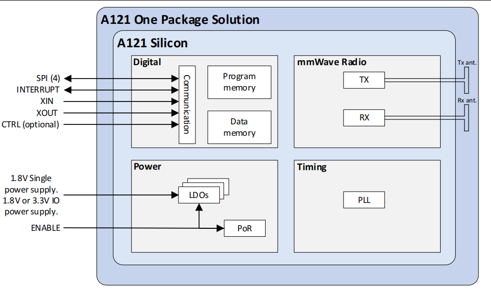 A121 采用 “单封装集成” 设计,内部包含 4 大功能模块,无需外部额外芯片即可工作,极大简化了无人机硬件设计。各模块功能如下表: