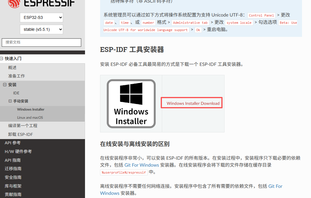 - 在 “Install the Tools” 部分,找到 “Windows” 对应的下载链接(如 “ESP-IDF Tools Installer for Windows”),点击下载 ESP-IDF 安装工具(文件格式为.exe,大小约 10-20MB)。