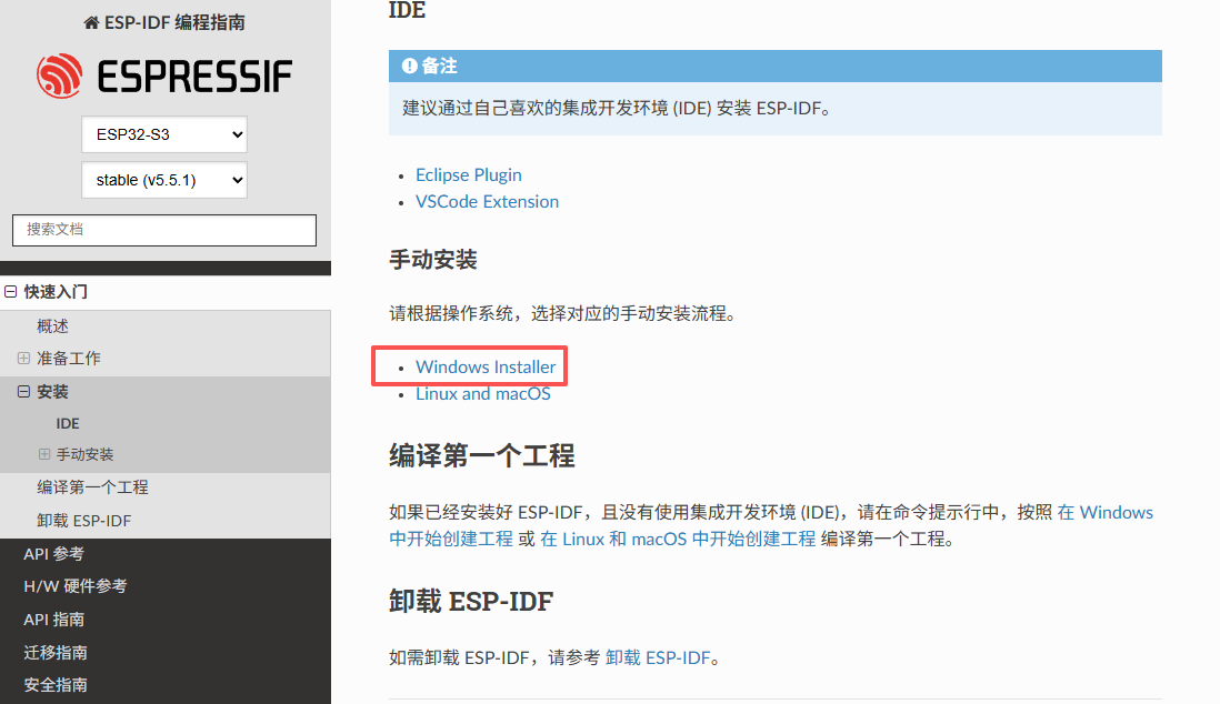 - 打开浏览器,访问 ESP-IDF 官方文档的 “Get Started” 页面:https://docs.espressif.com/projects/esp-idf/en/latest/esp32/get-started/index.html#install-the-tools。