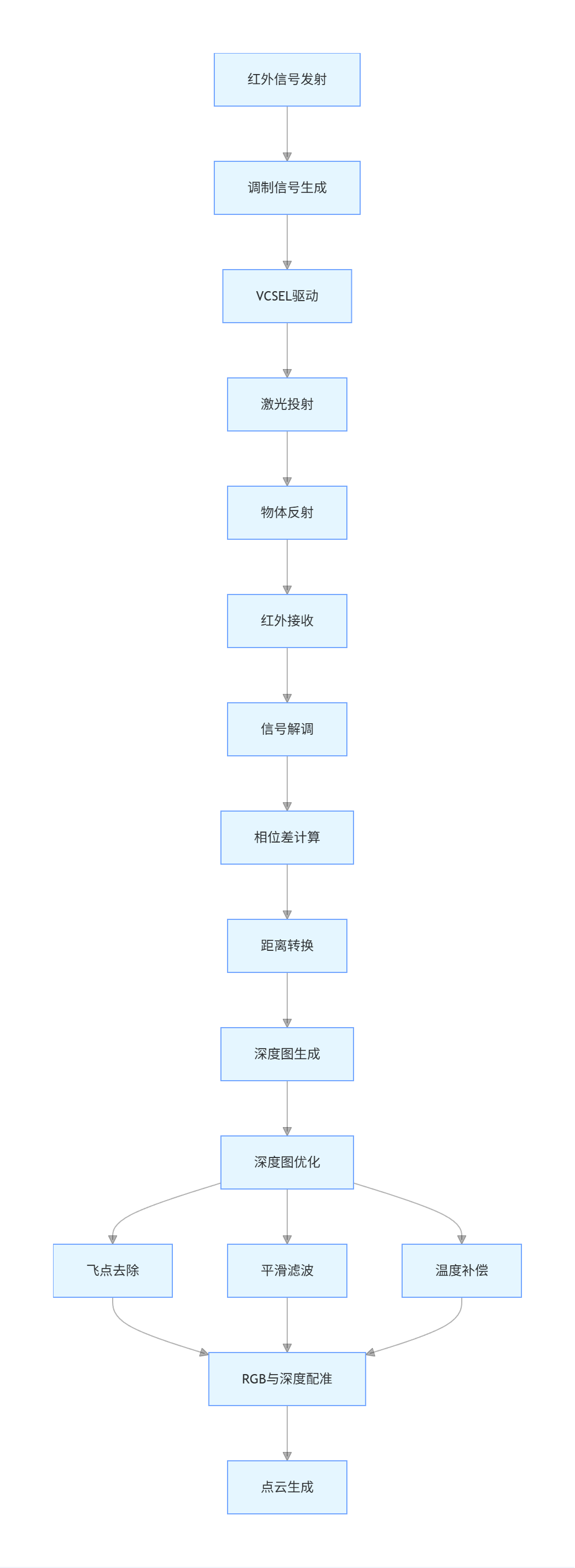 TOF:Z = (c*Δt)/2(c:光速,Δt:往返时间);结构光:基于编码图案形变的三角计算 |