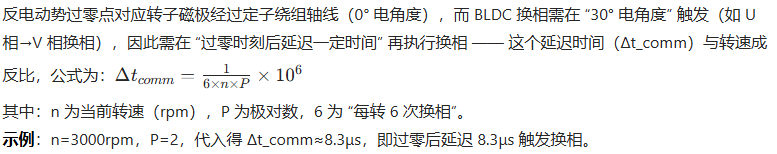 | 转速计算模块 | 过零间隔处理、定时器溢出补偿、转速公式计算 | 3.10.2 节(定时器溢出)、3.17 节(比较器延迟补偿)、表 44(延迟参数) | 输出实时转速(rpm),为转速闭环控制提供反馈 |