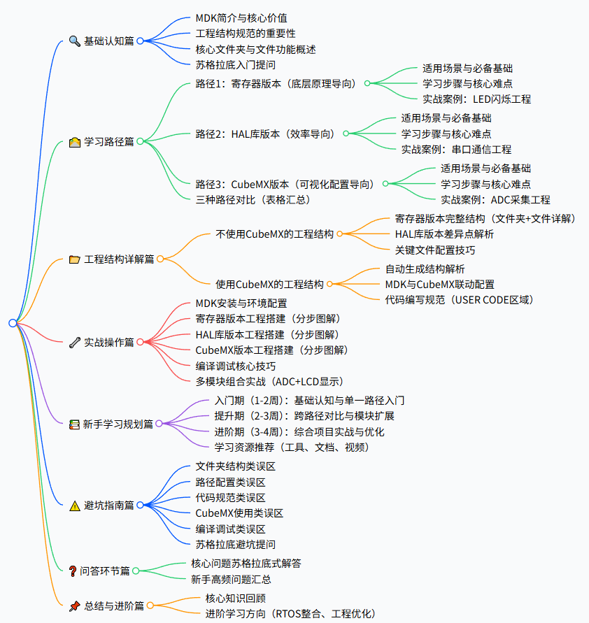 本文基于行业通用的 MDK 工程结构规范,以 “菜鸟快速入门” 为核心定位,兼顾专业性与通俗性,通过思维脑图梳理逻辑、表格对比关键信息、苏格拉底提问引导思考、实战案例落地应用的方式,系统讲解 MDK 工程结构的核心知识。全文涵盖基础认知、三种学习路径、实战操作、新手规划、避坑指南等核心内容,帮助新手从 “零基础” 到 “能独立搭建规范工程”,同时为有经验的开发者提供结构优化与效率提升的参考。