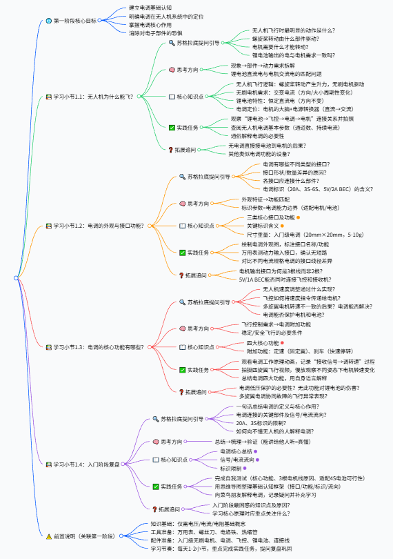 | 1.4 入门阶段复盘:你真的懂电调了吗? | 1. 用一句话总结“电调是什么”“电调的核心作用是什么”? 2. 电调在无人机系统中,连接的是哪两个关键部件?它们之间的信号/电流流向是怎样的? 3. 电调上的“20A”“3S”标识,分别限制了什么? 4. 如果让你给一个完全不懂无人机的人解释电调,你会怎么说? | 通过“总结→梳理→验证”巩固认知:先提炼核心概念,再梳理电调在系统中的位置和信号流向,最后通过“通俗解释”验证自己是否真的理解(能讲给别人听,才是真懂)。 | 1. 电调核心总结: - 定义:无人机动力系统的“中间控制器”,是连接飞控与电机、锂电池与电机的关键部件。 - 核心作用:转换电流类型(直流→交流)、精准控制电机转速、保障动力系统安全。 2. 信号/电流流向: - 控制信号:飞控→电调(通过信号控制接口)。 - 电流:锂电池→电调(动力输入,直流)→电机(动力输出,交流)。 - 供电:部分电调通过BEC→飞控/接收机(提供5V稳定电压)。 3. 标识限制: - “20A”:限制最大持续输出电流,选择电机时需确保电机最大电流≤20A。 - “3S-6S”:限制适配锂电池节数,超过会烧毁电调内部元件。 | 1. 自我测试:完成“入门认知阶段测试”: - 问题1:电调的核心功能有哪些?(至少答3个) - 问题2:电调的电机输出接口为什么是3根线? - 问题3:20A/3S电调,能适配4S锂电池吗?为什么? 2. 整理笔记:整理本阶段学习笔记,用思维导图呈现“电调基础认知”的核心框架(包含接口、功能、标识、信号流向)。 3. 教学相长:找1个同是菜鸟的朋友,用10分钟向他解释电调的基础概念,记录他的疑问,针对性补充学习。 | 1. 入门阶段你最困惑的知识点是什么?为什么? 2. 结合本阶段学习,你觉得接下来学习电调的“核心原理”时,应该重点关注什么? |