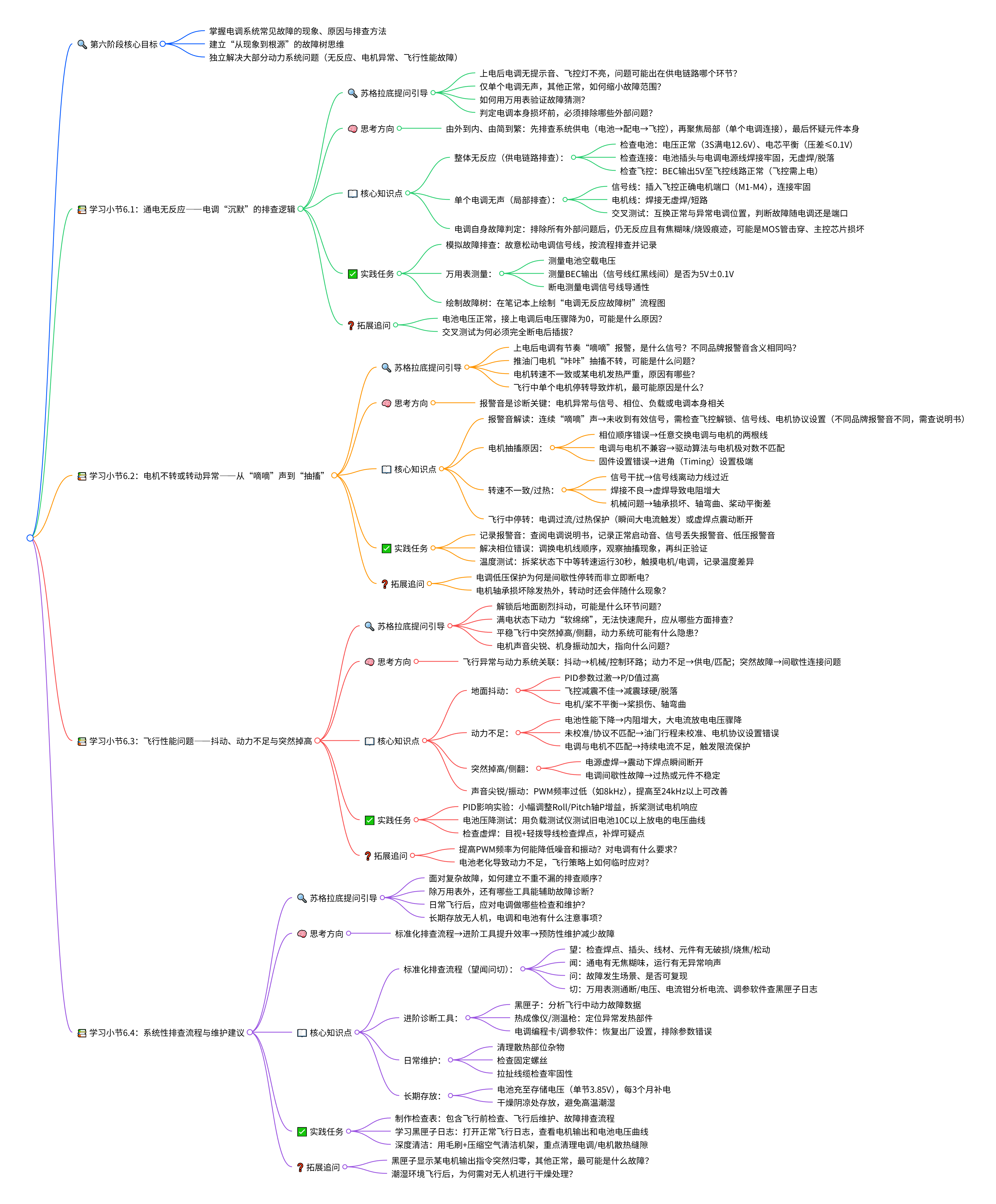 | 6.4 系统性排查流程与维护建议 | 1. 面对一个复杂的故障,如何建立一个不重不漏的排查顺序? 2. 有哪些工具可以极大地帮助故障诊断?(除了万用表) 3. 日常飞行后,应该对电调进行哪些简单的检查和维护? 4. 长期存放无人机时,对电调和电池有什么特别的注意事项? | 将零散的排查点整合成可重复执行的标准化流程。引入更专业的工具提升效率。建立预防性维护习惯,减少故障发生。 | 1. 标准化排查流程(“望闻问切”): - 望(视觉检查):检查所有焊点、插头、线材有无破损、烧焦、虚焊、松动。检查电调、电机有无物理损伤。 - 闻(嗅觉/听觉检查):通电时有无焦糊味;启动和运行中有无异常响声(如摩擦声、啸叫声)。 - 问(逻辑分析):故障是在什么情况下发生的?(首次通电?炸机后?更换部件后?)故障现象是否可复现? - 切(工具测量):使用万用表测量通断、电压;使用电流钳或带电流计的电源分析电流;使用调参软件查看黑匣子日志,分析故障瞬间的电机指令、电流、电压数据。 2. 进阶诊断工具: - 黑匣子(Flight Log):现代飞控能记录详细的飞行数据,是分析复杂飞行中动力故障的“神器”。 - 热成像仪或测温枪:快速定位异常发热的部件(电调、电机、焊点)。 - 电调编程卡/调参软件:用于确认和恢复电调的出厂设置,排除参数错误。 3. 日常维护: - 飞行后清理机架上的灰尘、草屑,特别是电调和电机散热部位的杂物。 - 检查所有固定螺丝(特别是电机和电调固定螺丝)是否松动。 - 轻轻拉扯所有主要线缆,检查其牢固性。 4. 长期存放: - 将电池充电至存储电压(通常为单节3.85V),并每3个月检查补电一次。 - 将无人机存放在干燥、阴凉处,避免高温和潮湿环境导致电调元器件老化。 | 1. 制定你的检查表:结合本阶段所学,制作一份包含“飞行前检查”、“飞行后维护”、“故障排查流程”的清单表格。 2. 学习查看黑匣子日志:在调参软件中打开一次正常的飞行日志,尝试找到电机输出(motor)和电池电压(battery)的曲线图,观察其变化规律。 3. 进行一次深度清洁:使用毛刷和压缩空气(或吹气球),对你的练习机架进行一次彻底的清洁,重点关注电调和电机的散热缝隙。 | 1. 黑匣子日志中如果显示某个电机的输出指令突然归零,而其他电机指令正常,最可能指向哪部分的故障? 2. 为什么在潮湿环境飞行后,即使当时没有故障,也建议对无人机进行干燥处理? |