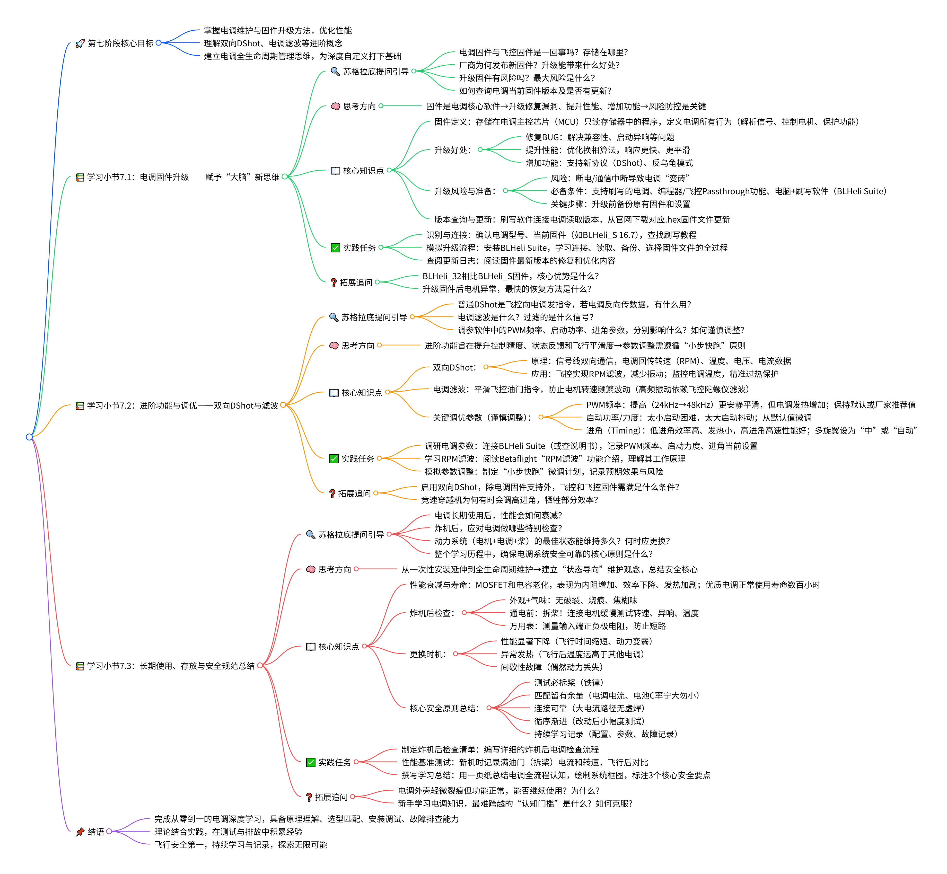 | 7.1 电调固件升级:赋予“大脑”新思维 | 1. 电调的“固件”和飞控的“固件”是一回事吗?它存储在哪里? 2. 为什么厂商会发布新固件?升级固件能带来什么好处? 3. 升级固件有风险吗?最大的风险是什么? 4. 如何知道我的电调当前固件版本,以及是否有新版本可用? | 理解固件是电调的核心软件,升级如同给电脑安装新系统,可以修复漏洞、提升性能、增加功能。 | 1. 固件是什么:固件是写入电调主控芯片(MCU)只读存储器中的程序,它定义了电调如何解析信号、控制电机、执行保护等所有行为。不同固件(如BLHeli_S, BLHeli_32, SimonK)算法不同,性能各异。 2. 升级的好处: - 修复BUG:解决已知问题,如特定电机兼容性差、启动异响等。 - 提升性能:优化换相算法,使电机响应更快、更平滑;提高效率。 - 增加功能:支持新的协议(如从Oneshot升级到DShot)、增加“反乌龟”模式、可调参数更丰富。 3. 升级的风险与准备: - 变砖风险:升级过程中断电或通信中断,可能导致固件损坏,电调无法使用。 - 必备条件:电调必须支持固件刷写(通常通过信号线);需要对应的编程器(如USB Linker)或某些飞控的Passthrough功能;需要电脑和刷写软件(如BLHeli Suite)。 - 关键步骤:务必在升级前备份原有固件和设置! 4. 查看与更新:通过刷写软件连接电调即可读取当前固件版本。更新固件通常需要从固件官网或社区下载对应的.hex文件。 | 1. 识别与连接:确认你的电调型号和当前使用的固件(如BLHeli_S 16.7)。查找该电调对应的刷写教程(通常需特定编程器)。 2. 模拟升级流程:在不实际刷写的情况下,安装BLHeli Suite软件,通过教程学习如何连接、读取、备份和选择固件文件的全过程。 3. 查阅更新日志:找到你电调固件最新版本的更新说明(Change Log),阅读其修复和优化了哪些内容。 | 1. BLHeli_32固件相比BLHeli_S固件,主要的优势在哪里?(提示:32位MCU,双向DShot) 2. 如果升级固件后电机出现异常,最快恢复的方法是什么? |