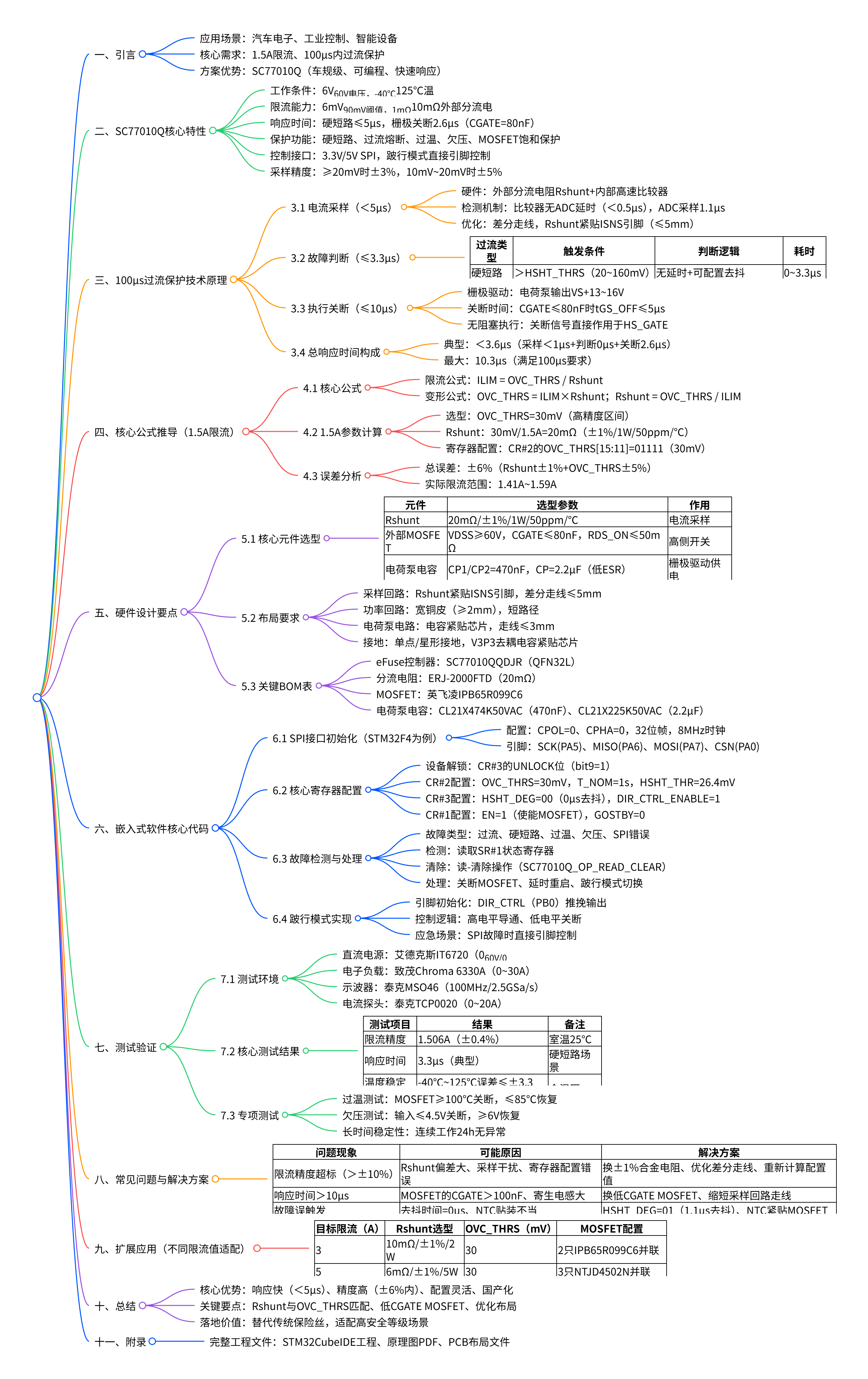 国产南芯 SC77010Q 作为车规级智能 eFuse 控制器,凭借 “硬件化检测 + 可编程配置 + 快速栅极驱动” 架构,能轻松实现 100μs 以内的过流保护响应,且支持精准限流调节。本文以 1.5A 限流需求为核心,从技术原理、公式推导、硬件设计、软件开发、测试验证等维度,全面拆解 SC77010Q 的应用方案,内容通俗易懂,多表格呈现关键数据,附完整嵌入式核心代码,助力工程师快速落地项目。