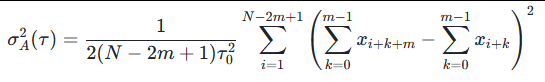 对于平稳随机过程的离散时间序列\(\{x_i\}\)(\(i=1,2,...,N\)),其Allan方差的定义为:在采样时间间隔为\(\tau_0\)的情况下,取不同的平均时间\(\tau = m\tau_0\)(\(m\)为平均次数,\(m=1,2,...,M\),\(M \leq N/2\)),计算相邻两个平均数据的差值的平方的一半的均值,数学表达式为: