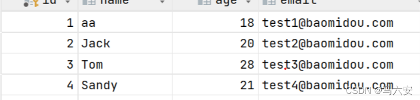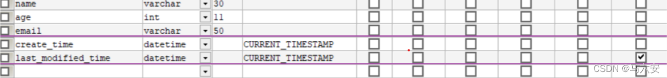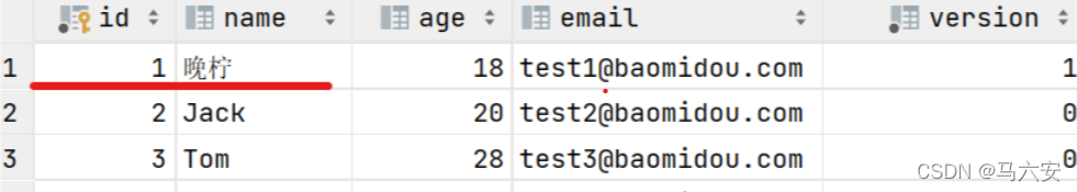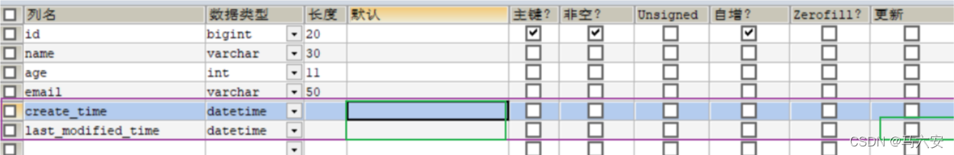 @Data public class User { @TableId(type = IdType.AUTO) private int id; private String name; private Integer age; private String email; //在代码中同步加入创建时间和最后修改时间的维护 private Date createTime; private Date lastModifiedTime; }完成后可以通过新增或更新