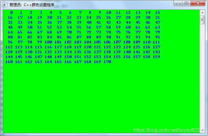 当然基本上所有的DOS命令当能被system()调用,下面主要说一下color命令的颜色设置,一共有16种颜色,编号0~15,由十六进制的0~F来指定。