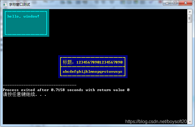 <windows.h>库函数:SetConsoleCursorPosition() 设置控制台光标位置;SetConsoleTextAttribute() 设置控制台文本属性,主要用它来设置颜色。用这两个函数在控制台屏幕上画2个在DOS时代可算得上比较洋气的字符窗口 ^_^