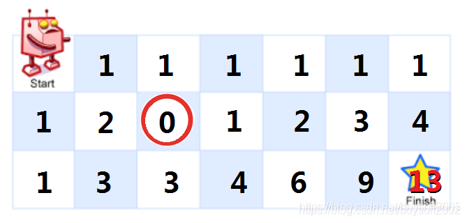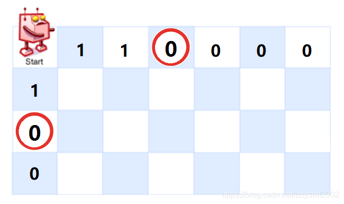 特例:当障碍出现在首行(或首列)时,障碍右边(或正下方)的格子都是机器人到不了的地方,所以障碍及其右侧(或下方)的格子都要置数为0,如下图所示: