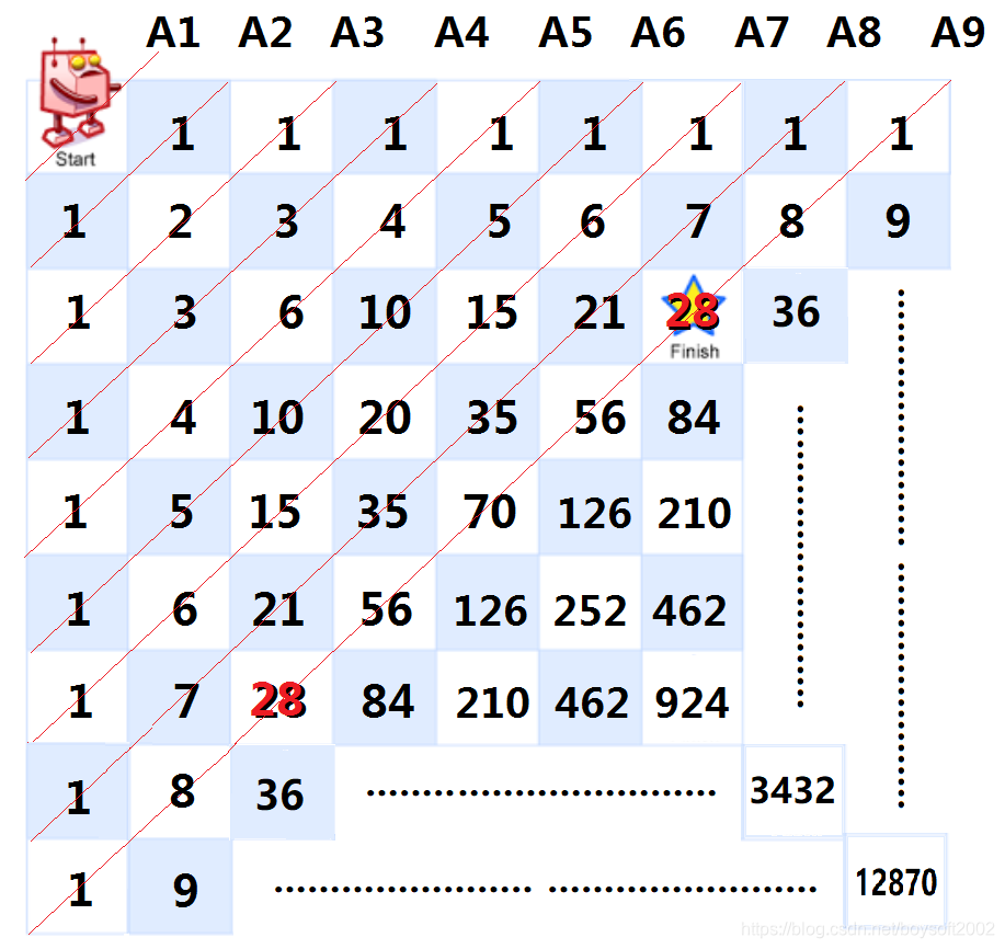 方法二:还是上面的思路,把地图扩展到正方形,如下图所示每条对角线串连的数字正好组成一个标准的杨辉三角形。如果杨辉三角形的每一行都用一个列表A表示,那么第m行第n列走法数值的所在位置就是列表 A[m+n-1] 的第m个数(或第n个,两者的值相等)。