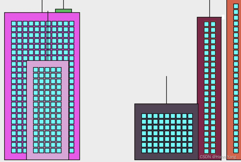 在这里停下来!如果您想尝试获得E级,请让建筑物看起来更逼真。具体来说,在建筑物顶部添加一个天线,其高度与建筑物的其余部分成正比。绘制向下并穿过建筑物的窗户。窗户的高度不应与建筑物的高度成正比,它们应该具有固定的宽度和高度。这意味着更高的建筑物和更宽的建筑物将有更多的窗户。