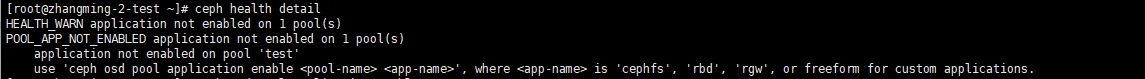 运行ceph health detail命令发现是新加入的存储池test没有被应用程序标记