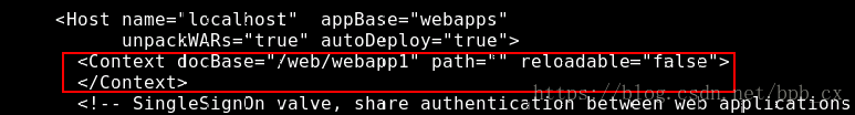 注: //docBase:web应用的文档基准目录; //reloadable 设置监视“类”是否变化; //path=“” 设置默认“类”