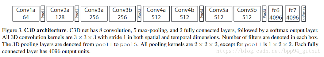 网络构架:5个卷积层(3X3X3,步长1)+5个max pooling层(第一层1X2X2,其余2X2X2)+2个fc层(4096)+softmax