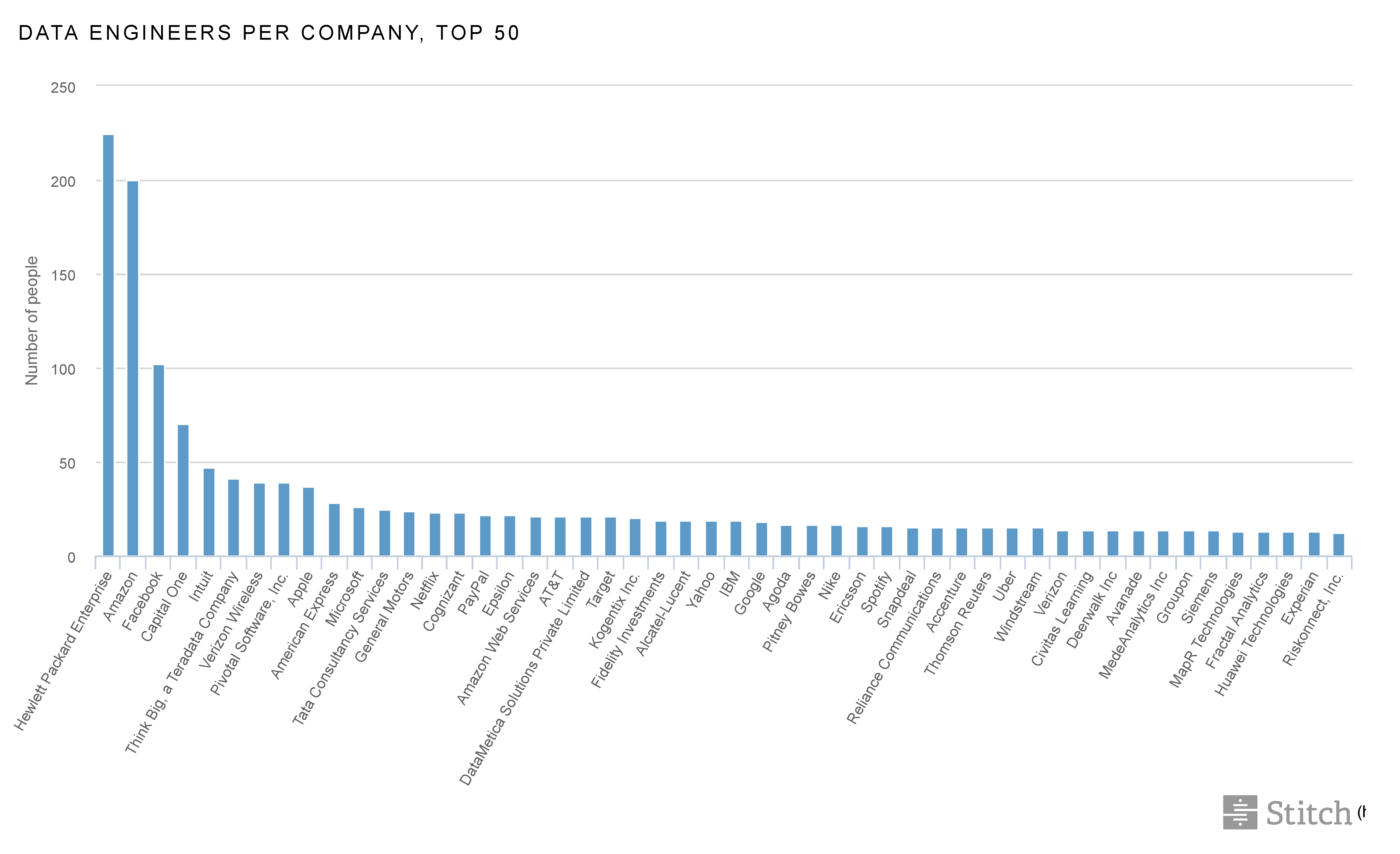 当我们看到聘用了数据工程师的具体公司时,他们在科技领域的受欢迎程度就更加明显了。在前十的公司里,只有两家公司不是专门从事技术或数据的:一家电信公司(Verizon)和一家金融机构(Capital One)。