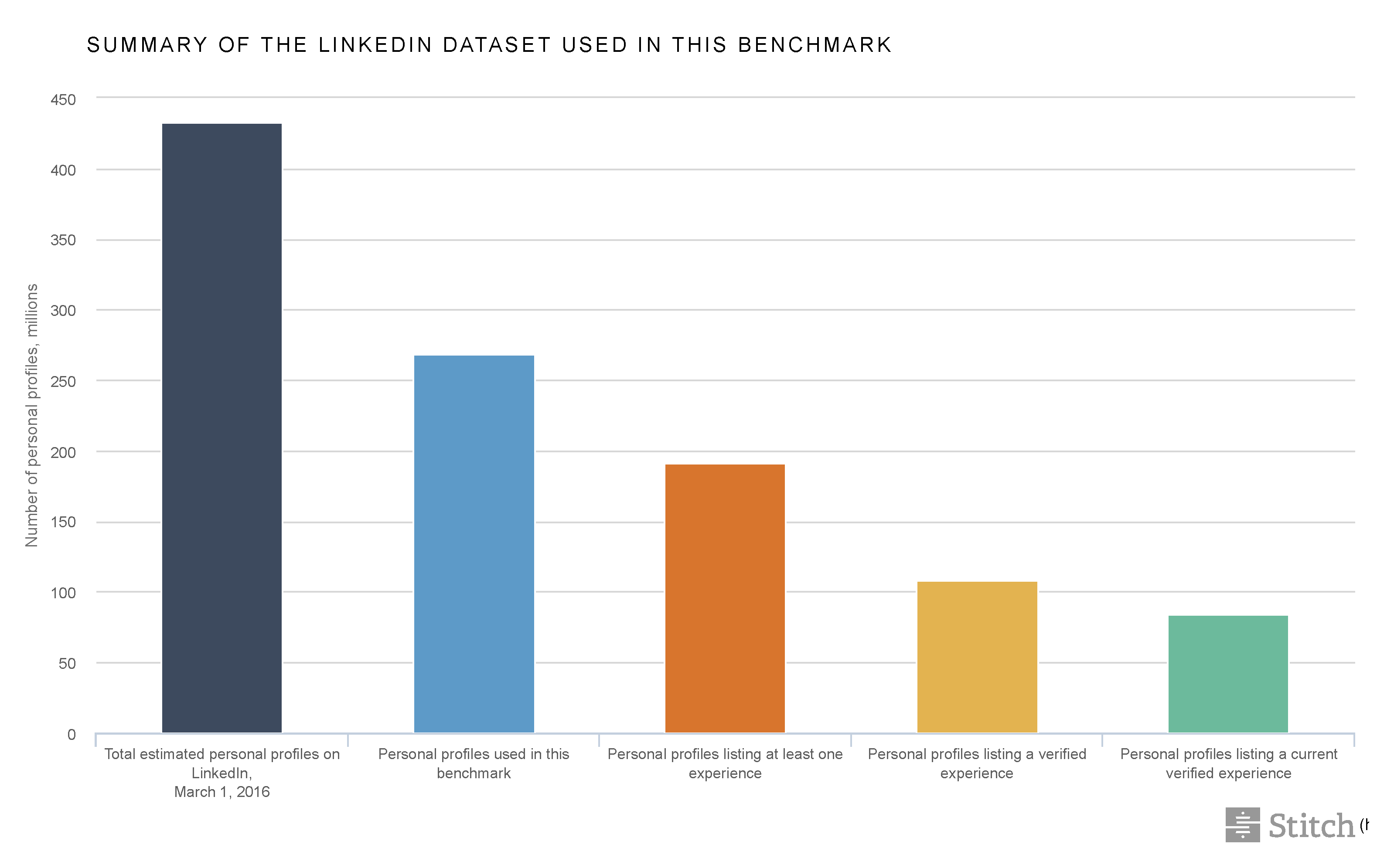截止 2016 年 3 月 1 日,Linkedin 上的个人档案大约 4.3 亿,此次参考了 2.6 亿例档案,其中列有至少一项经历的近 1.9 亿, 有一项已认证经历的超过 1 亿,当前经历已认证的近 8000 多万。