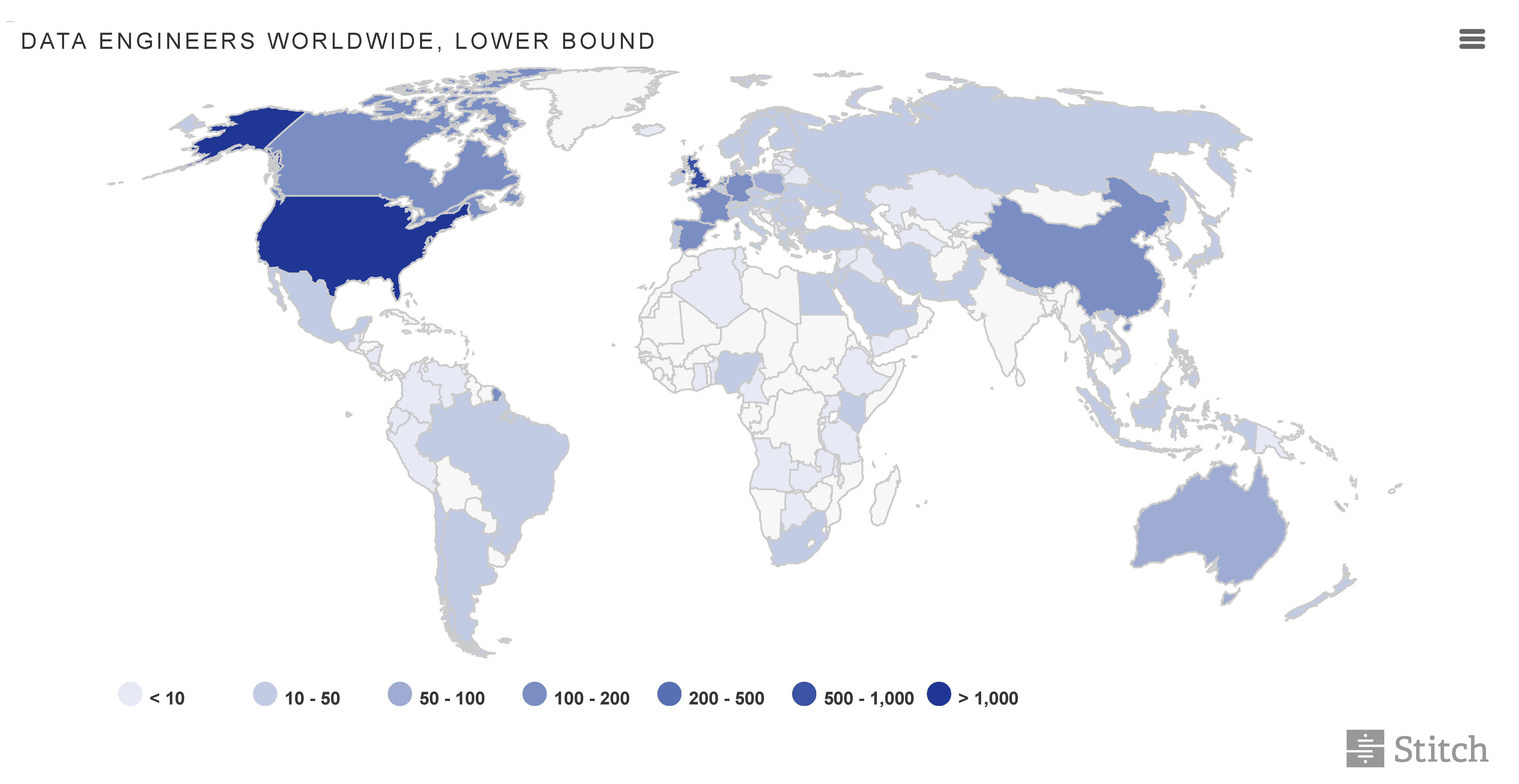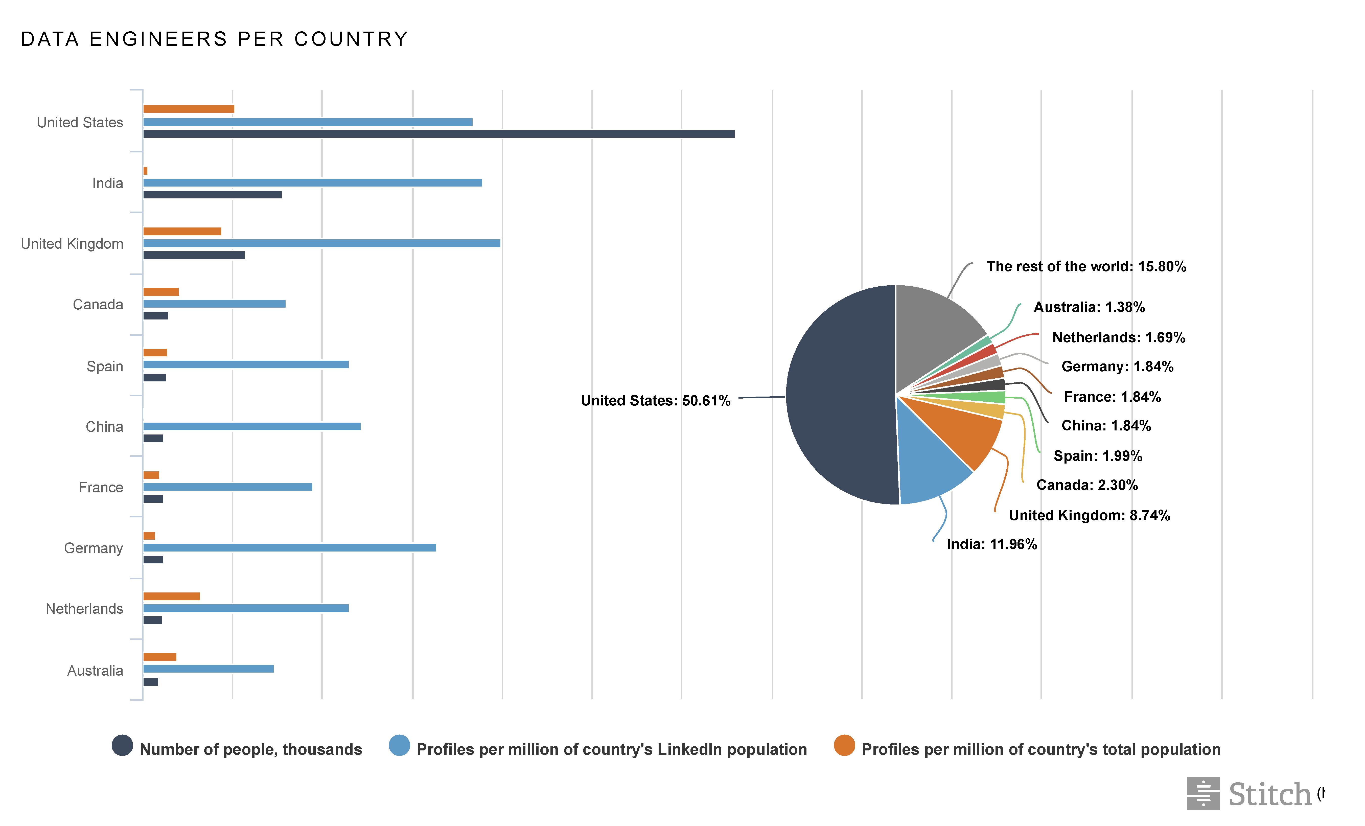 美国至今有着最多的数据工程师,也同样在全球有着最多的数据工程师档案:接近4倍多于排名第二的印度。