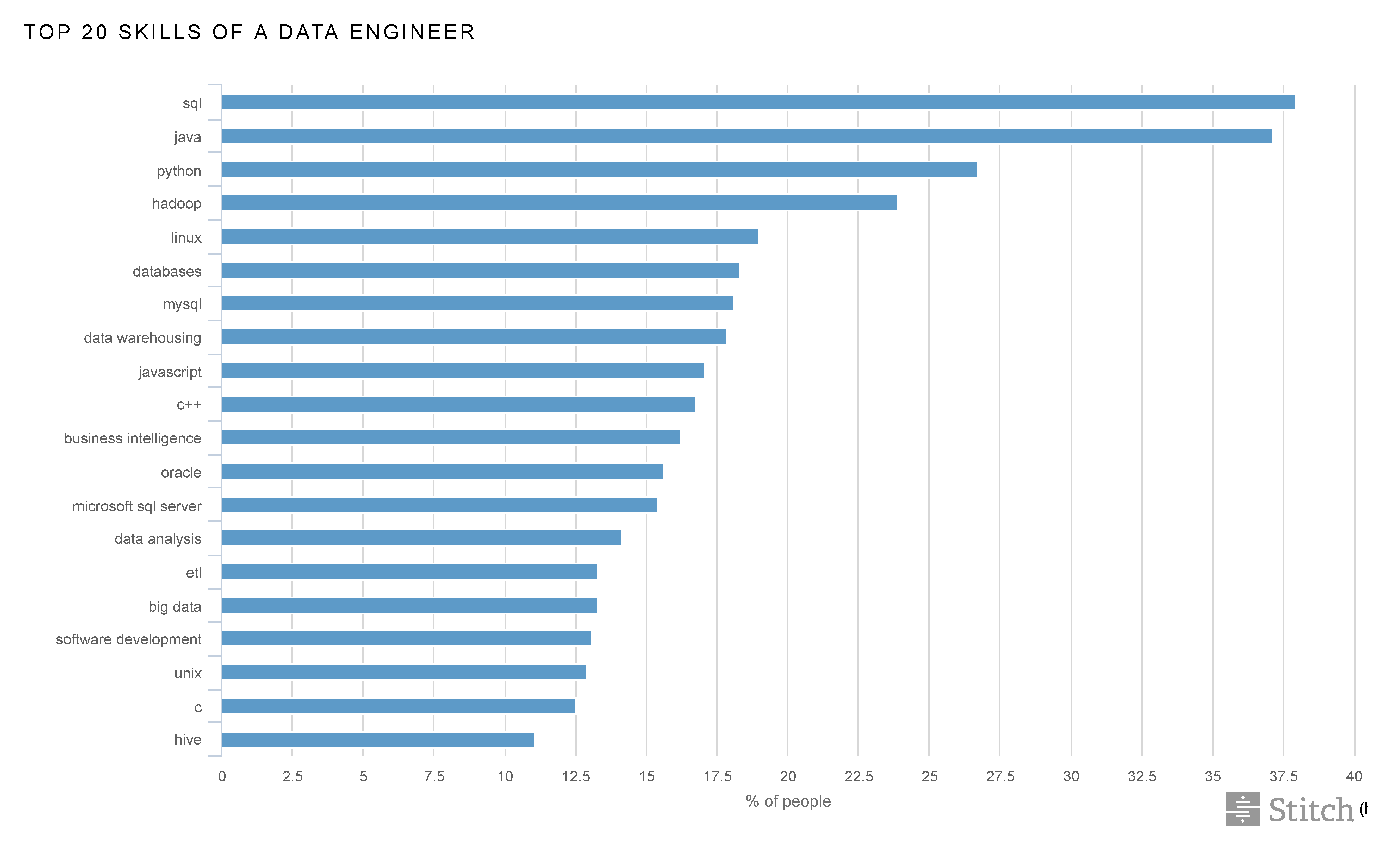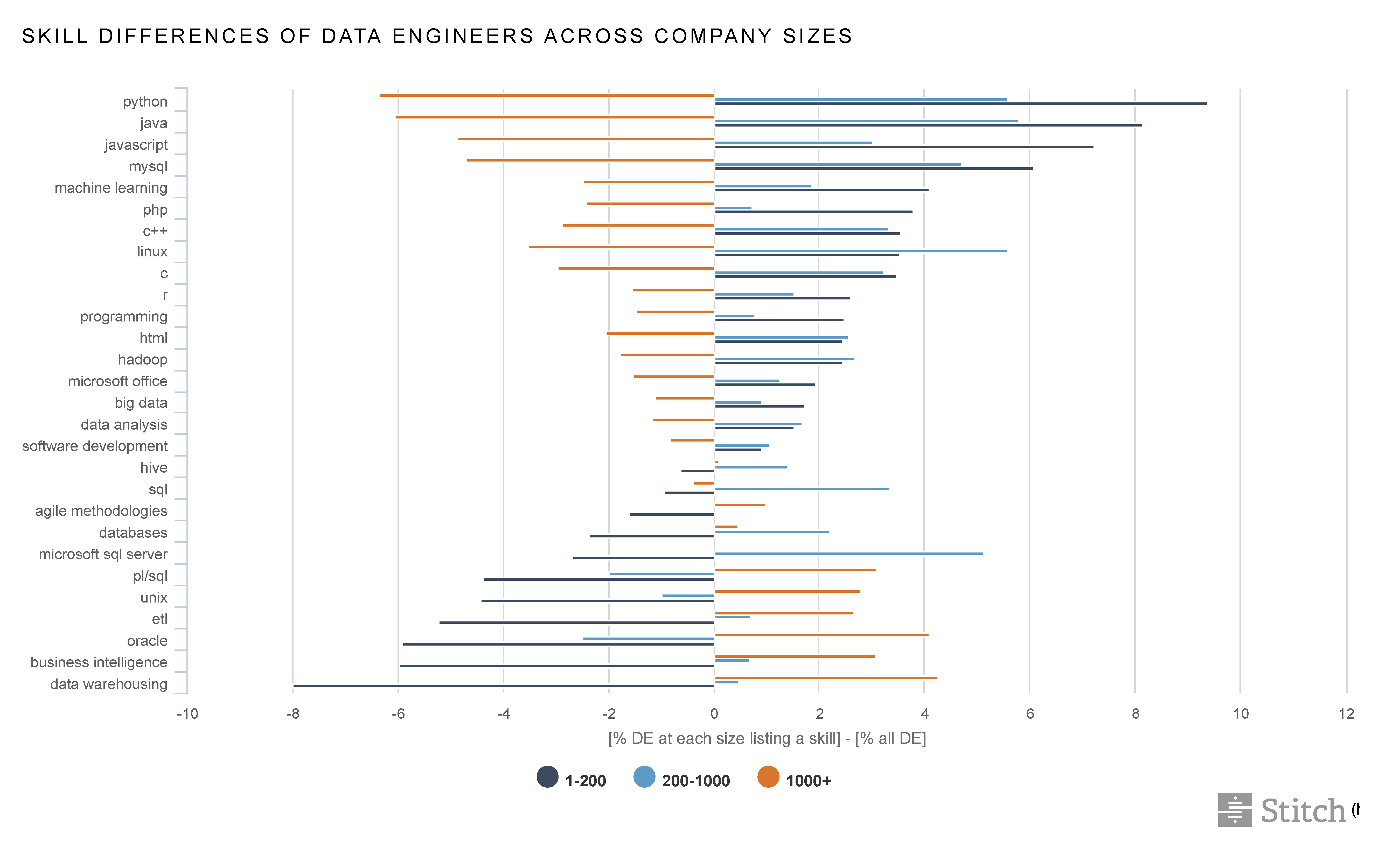 真实情况是,在规模更大的公司,数据工程师更在意 “企业级” 相关的技能,比如 ETL(Extract-Transform-Load)、BI(Business Intelligence:商业智能)、数据仓库等,而在较小的公司,数据工程师更多的把心力花在 Python、Java 等编程语言上(编者按:Python 和 Java 作为普通的编程语言,可以用来构建产品,这对于小公司来说属于核心业务)。