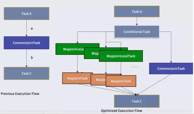 优化过程是把Join作业前面加上一个条件选择器ConditionalTask和一个分支。左边的分支是MapJoin,右边的分支是Common Join(Reduce Join)