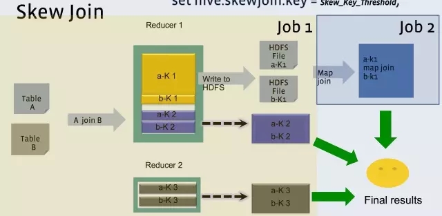 其原理是就在Reduce Join过程,把超过十万条的倾斜键的行写到文件里,回头再起一道Join单行的Map Join作业来单独收拾它们。最后把结果取并集就是了。如上图所示。