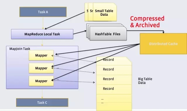 原理如上图,用户可以手动指定哪个表是小表,然后在客户端把小表打成一个哈希表序列化文件的压缩包,通过分布式缓存均匀分发到作业执行的每一个结点上。然后在结点上进行解压,在内存中完成关联。