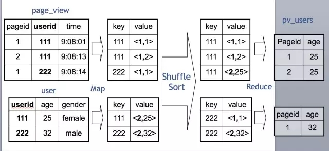 Map端会分别读入各个表的一部分数据,把这部分数据进行打标,例如pv表标1,user表标2.