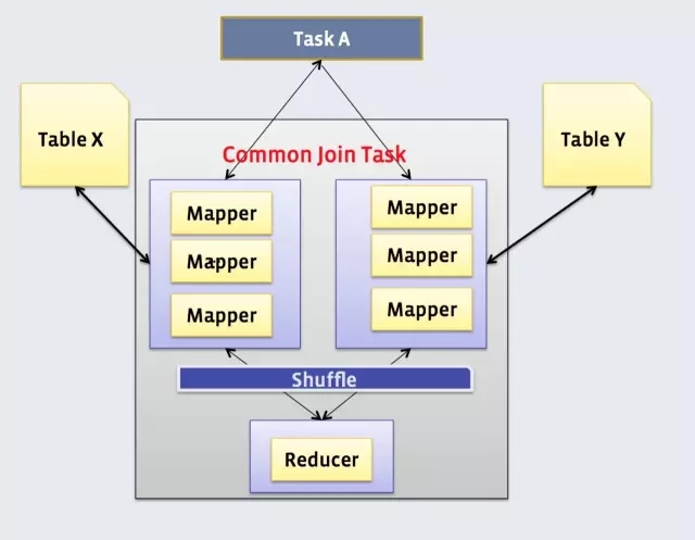 Map读取是分布式进行的。标完完后分发到Reduce端,Reduce 端根据Join Key,也就是关联键进行分组。然后按打的标进行排序,也就是图上的Shuffle Sort。