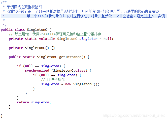 2.保证可见性:线程A在自己的工作线程内创建了实例,但此时还未同步到主存中;此时线程B在主存中判断instance还是null,那么线程B又将在自己的工作线程中创建一个实例,这样就创建了多个实例。