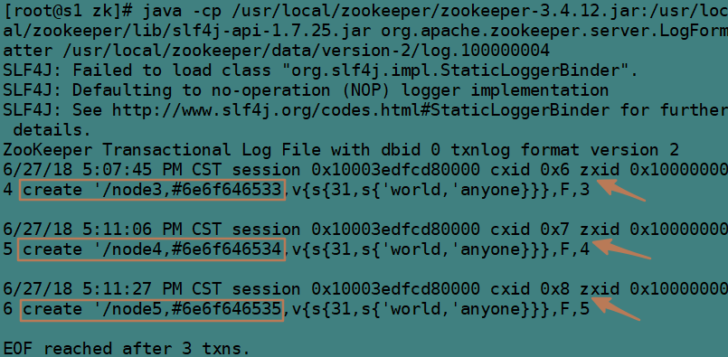 java -cp /usr/local/zookeeper/zookeeper-3.4.12.jar:/usr/local/zookeeper/lib/slf4j-api-1.7.25.jar org.apache.zookeeper.server.LogFormatter /usr/local/zookeeper/data/version-2/log.100000001