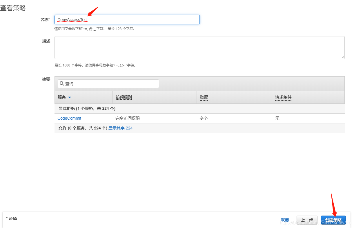 最后一步我们给策略取个名字“DenyAccessTest”。