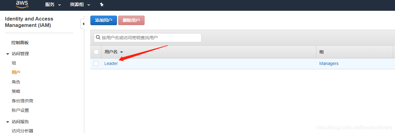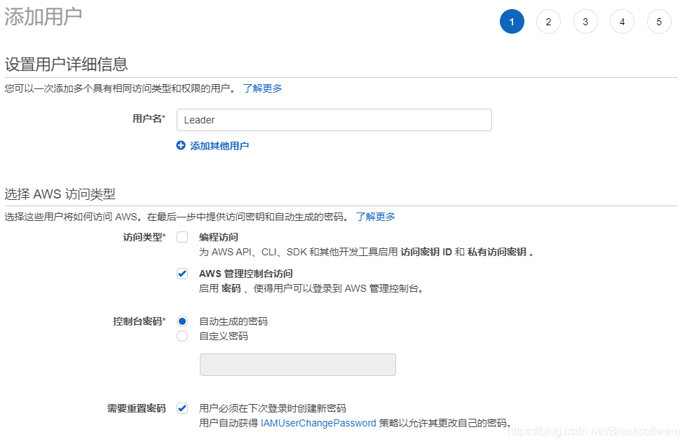 以“项目经理”为例,我们新建一个用户名叫“Leader”,并勾选“AWS管理控制台访问”,并让其自己设置密码。