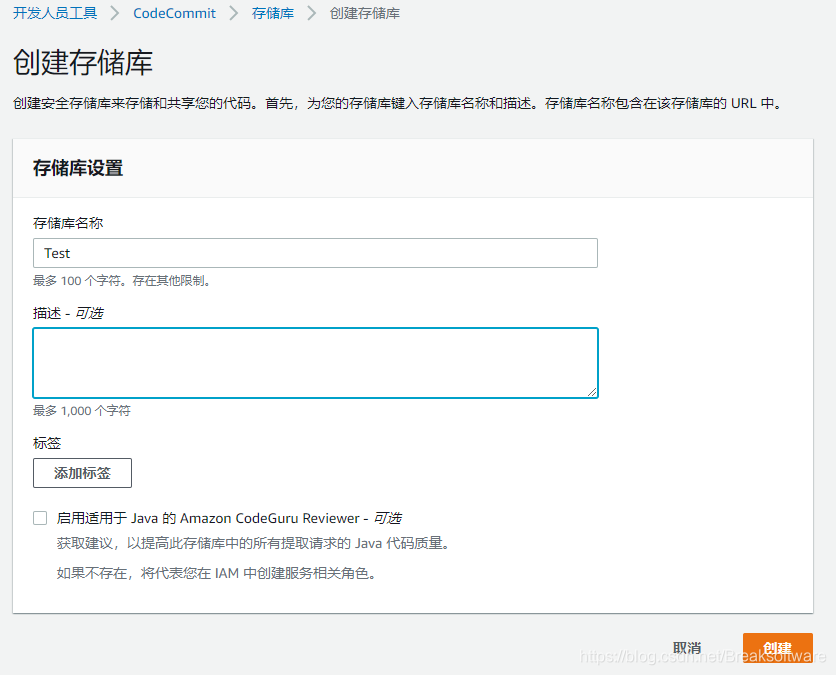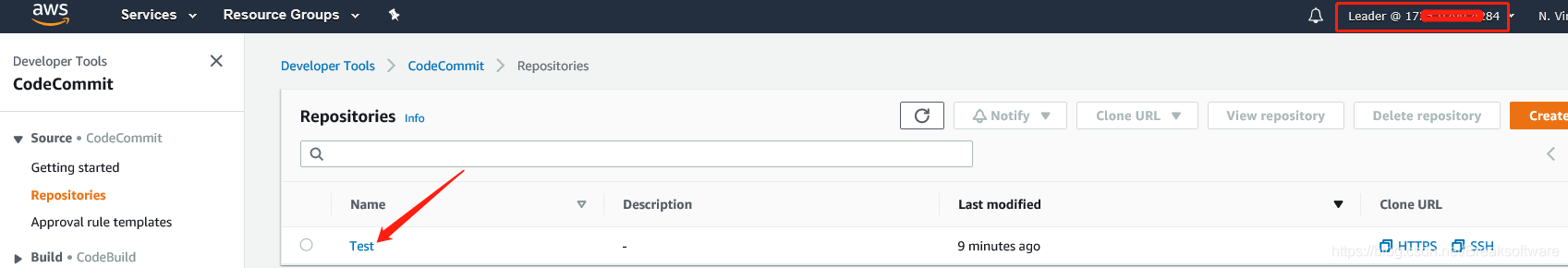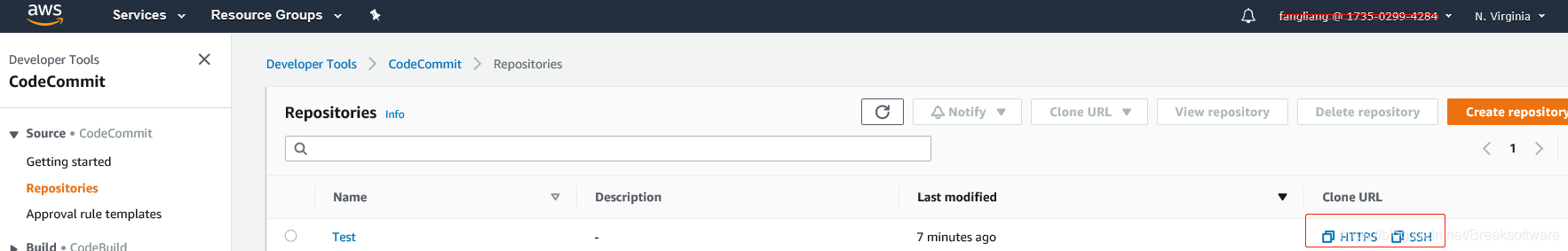 进入https://console.aws.amazon.com/codesuite/codecommit/repositories。我们创建一个测试代码库“Test”