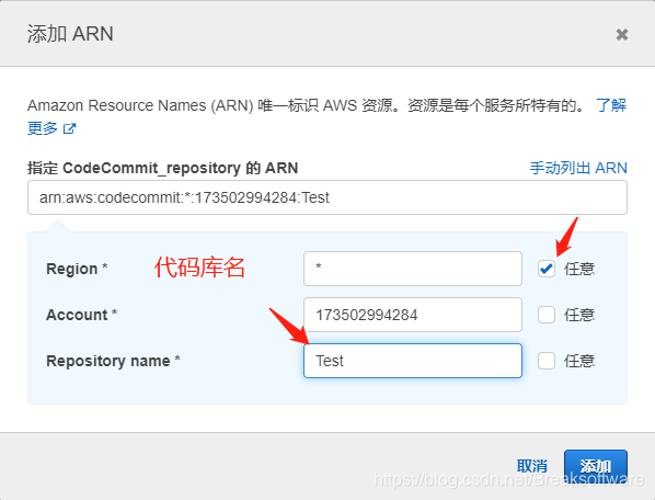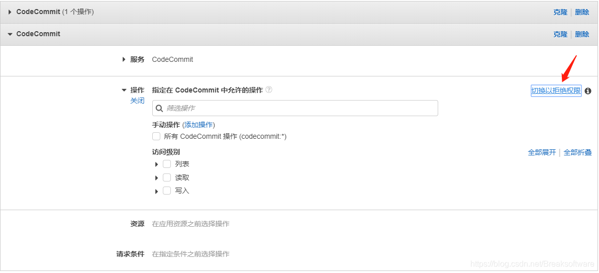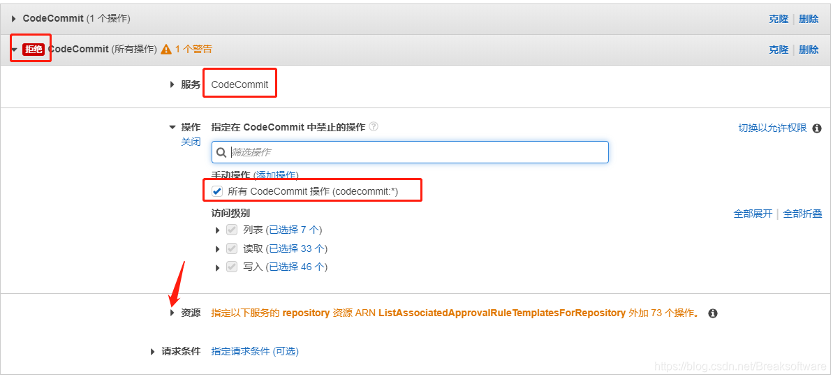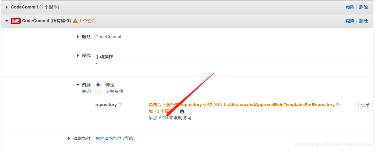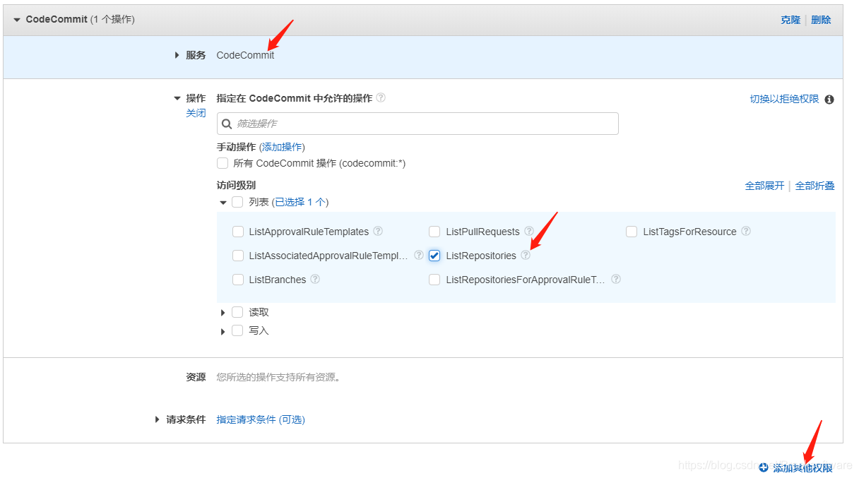 因为我们是对CodeCommit服务做限制,所以先在“服务”栏选择它。然后在“操作”栏勾选“ListRepositories”。这样可以保证Leader可以看到所有项目。然后添加一个限制策略