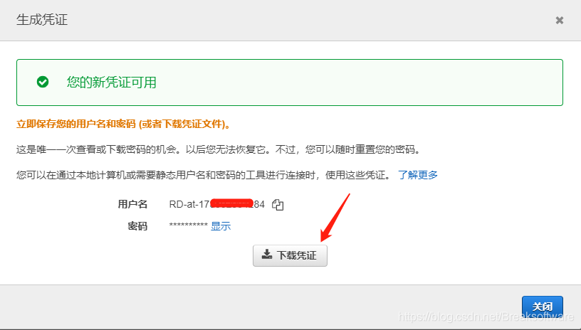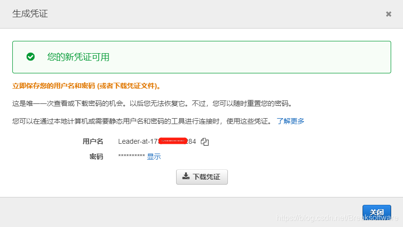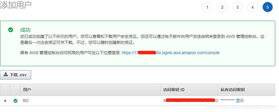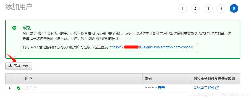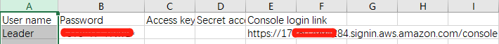 最后这个页面非常重要。我们可以把该CSV下载下来,交给名字叫Leader的用户。其中包含了用户名、密码、以及IAM登录的地址。