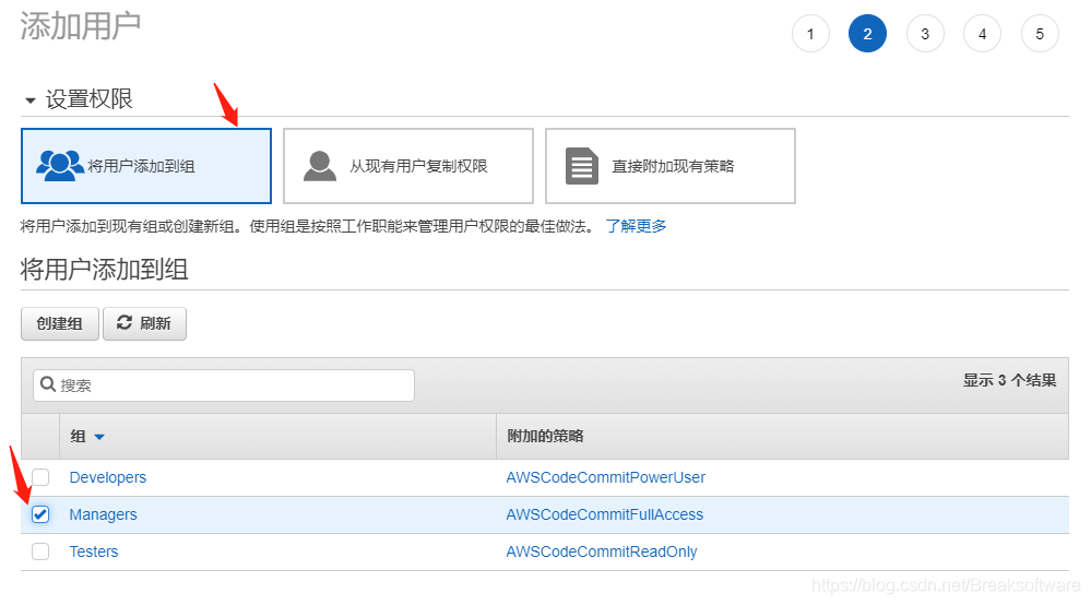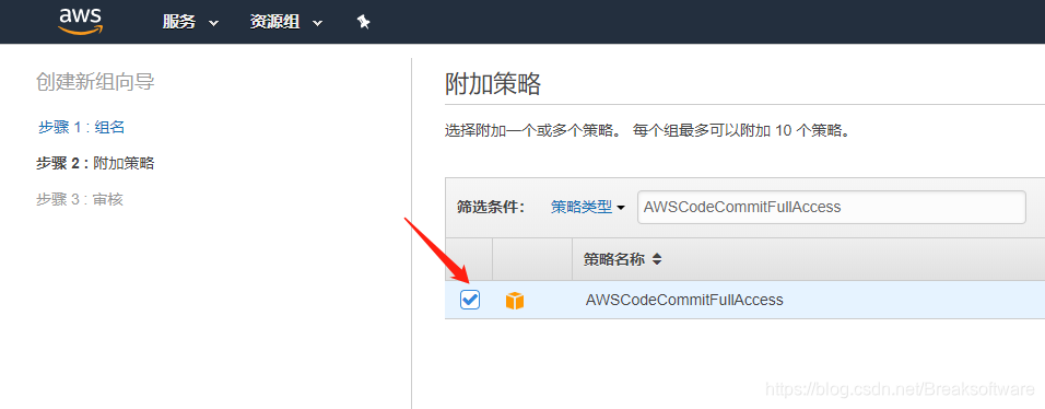 我们以“项目经理”为例,创建的组名叫“Managers”。在附加策略页面,我们选择“AWSCodeCommitFullAccess”
