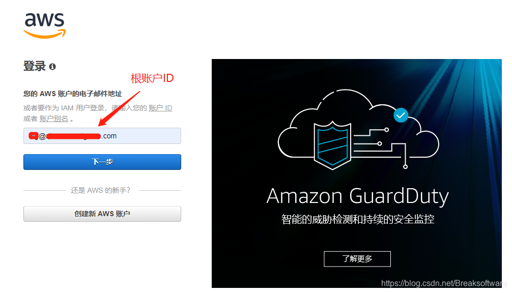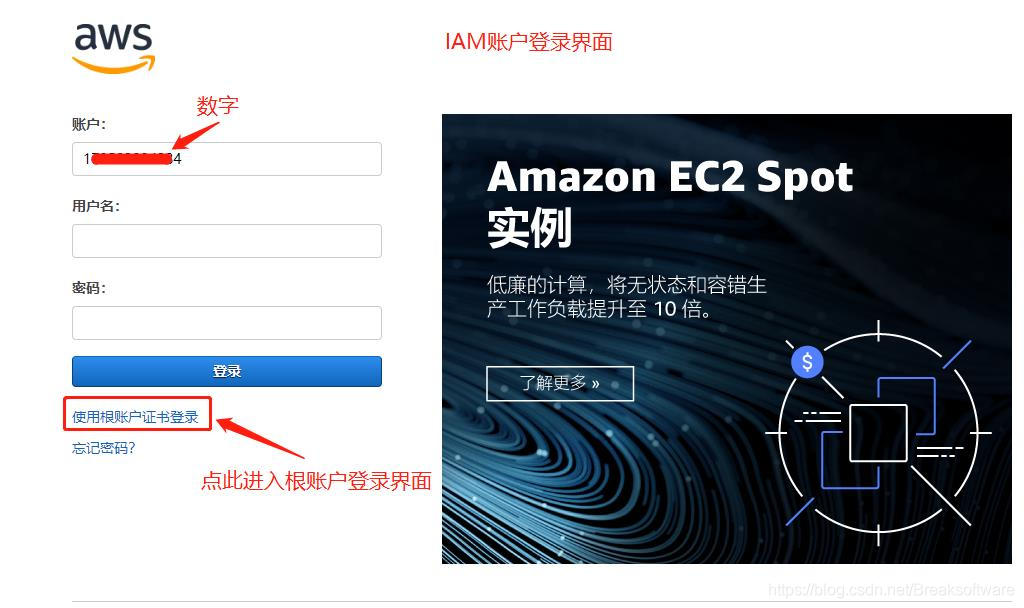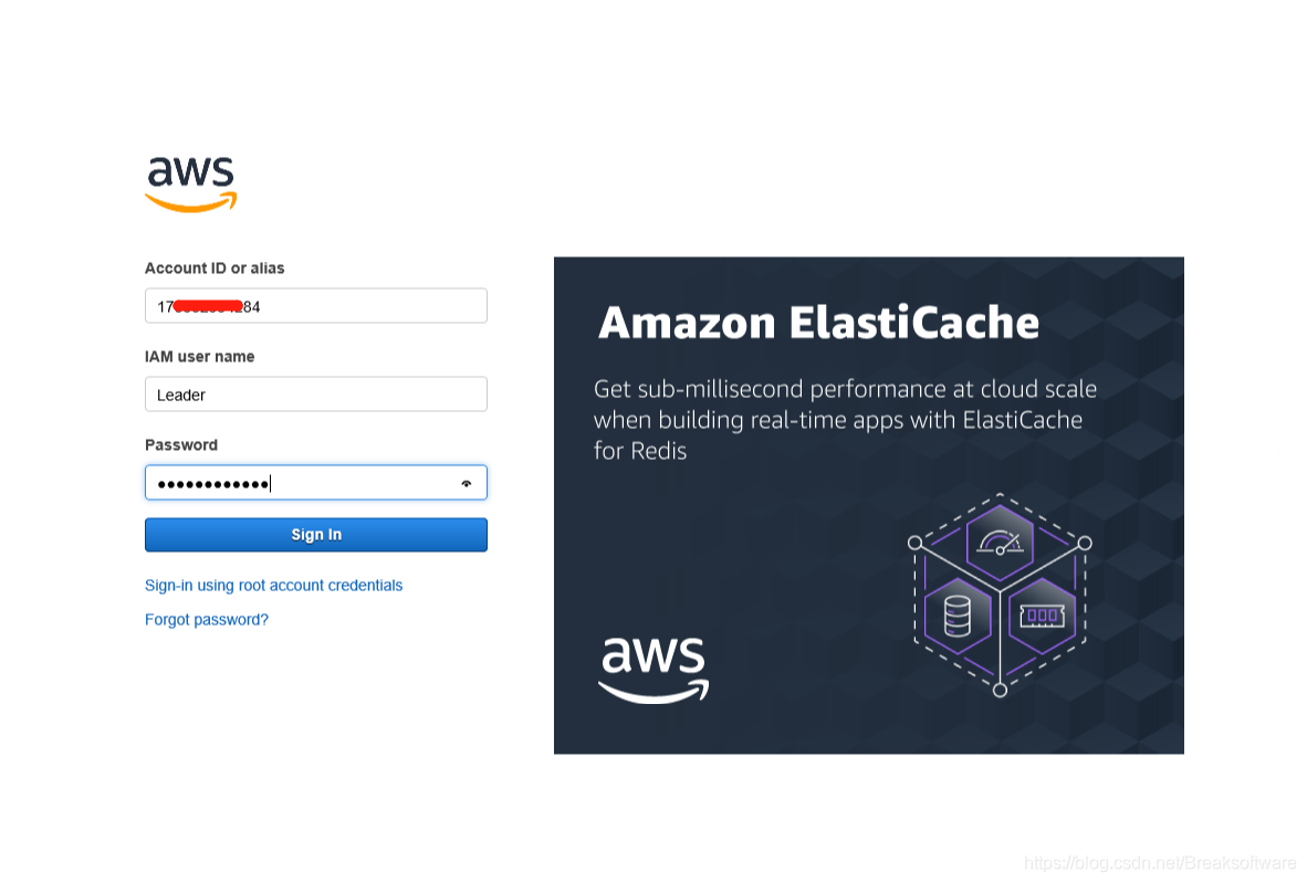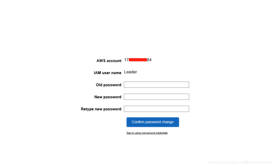 将“新建用户”最后一步生成的文件交给Leader妥善管理。他需要访问Console login link地址(如果你是在和根账户登录的同一台电脑上操作,建议启动一个其他内核的浏览器打开,否则将会把根账户踢出)。Account ID or alias将会被自动填好,只要填写上面文件中的用户名和密码即可。