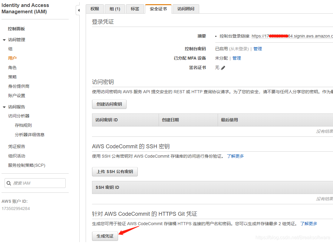 用户添加成功后,我们也不用把该页面的CSV文件提供给他。只要把“安全证书”页面中生成的凭证给他即可。他可以使用其中的用户名和密码拉取代码库。