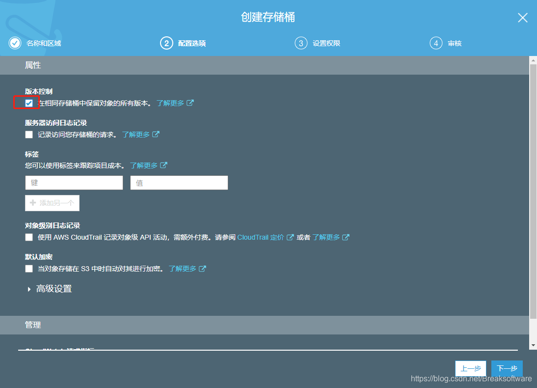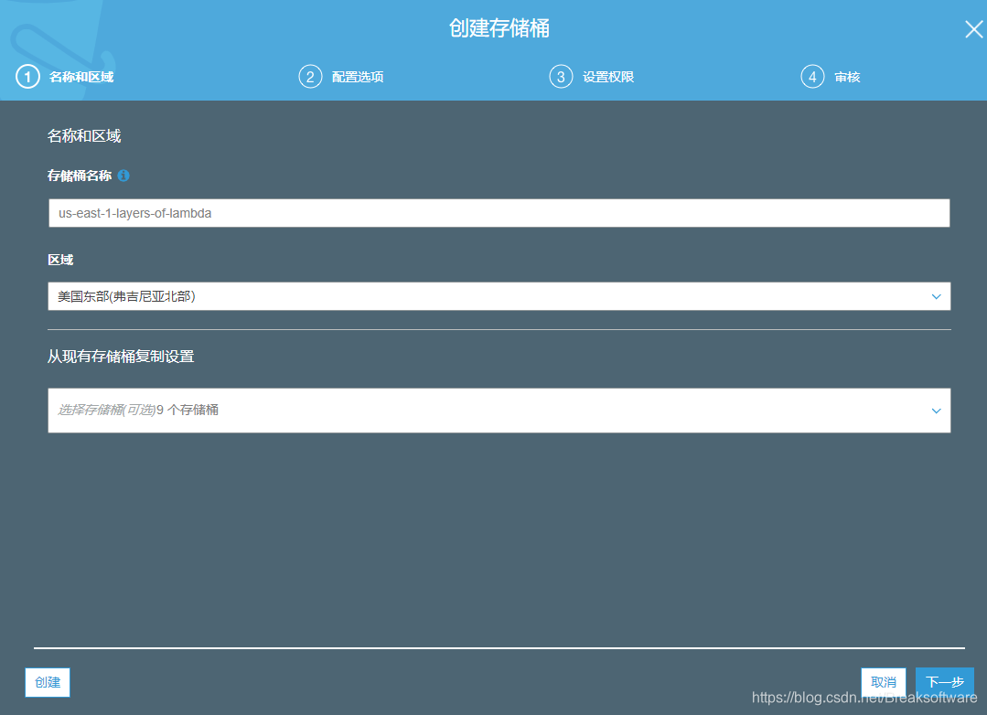 给桶的名字取名规则是:“区域”-layers-of-lambda。因为我们将“生产”和“测试”环境部署在不同的区域中,所以可以通过配置不同的区域来对同一套代码进行分区部署。(具体看之后介绍的buildspec.yml和CodeBuild设置)