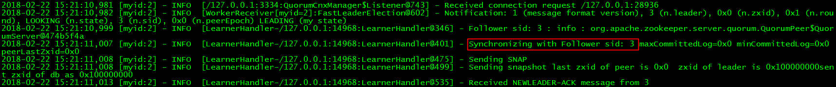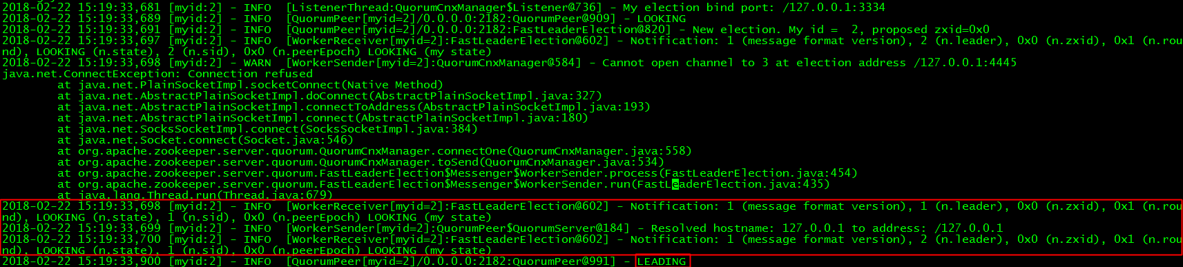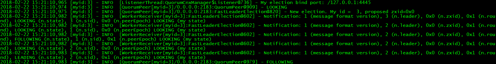 第三行显示z2也发起了一次选举,由于此时z3没有启动,所以它只能和z1进行通信。最终它们使用FastLeaderElection协商出z2作为Leader。