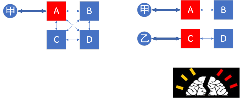 但是,如果此时CD和AB断开了连接。以获得2票成为Leader的原则,很有可能CD选举出C为Leader,D从此和C同步数据。AB选举出A为Leader,B只和A同步数据。假如此时乙用户要接入,而不巧接入到C或者D。那么甲乙对数据的修改就是隔离的。这样一个系统中出现两个Leader的现象称之为“脑裂”,这当然是不能接受的。