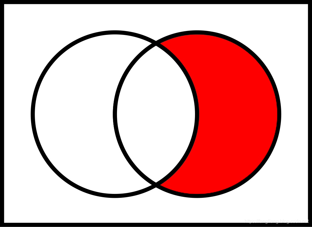 可以见得,两个集合的差集存在两个可能性:一种是在左侧集合不在右侧集合中的部分;一种是在右侧集合不在左侧集合中的部分。