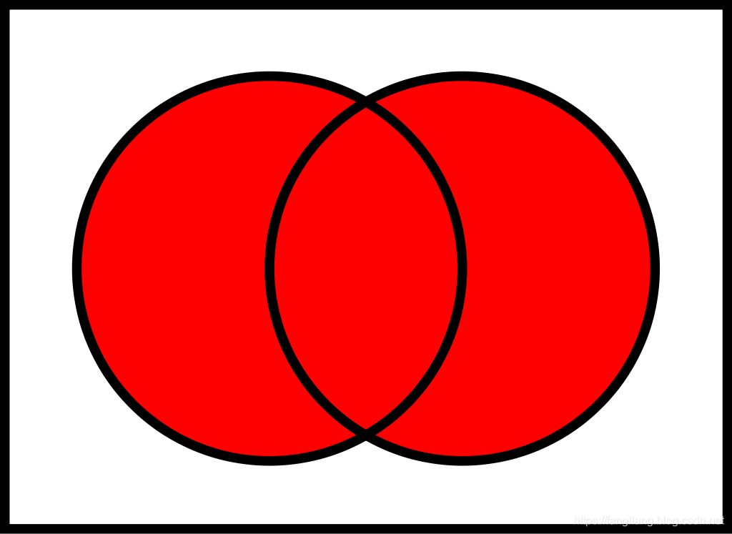并集是指两个集合组合在一起集合(图中红色区域)。
