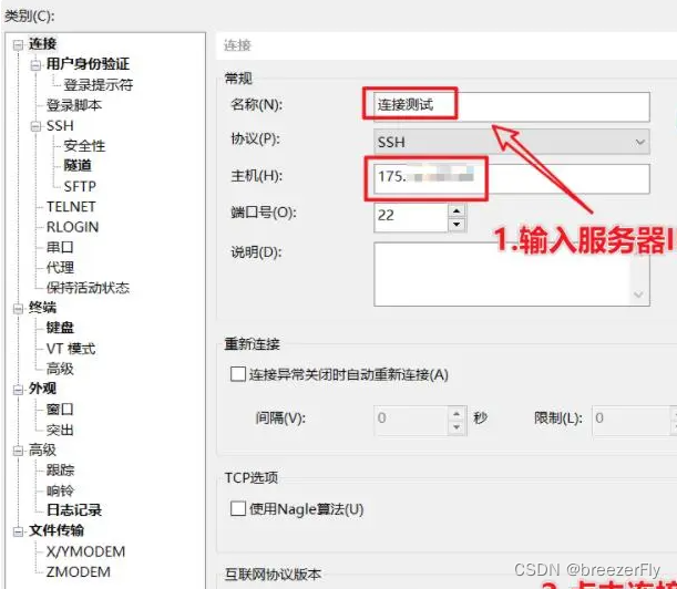 3.在“会话选项”页面中,选择协议和终端类型;