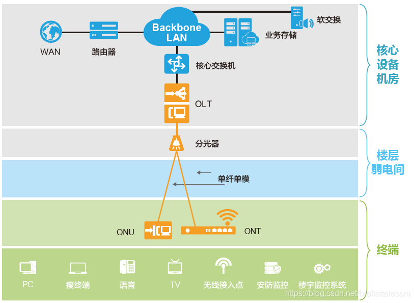 PON(Passive Optical Network)是一种点到多点(P2MP)结构的无源光网络。