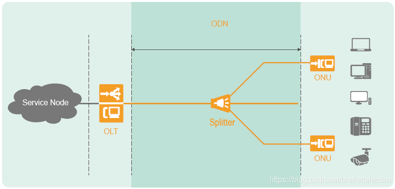 ODN(Optical Distribution Network)是由光纤、一个或多个无源光分路器(Passive Optical Splitter, POS)组成,连接OLT和ONU。