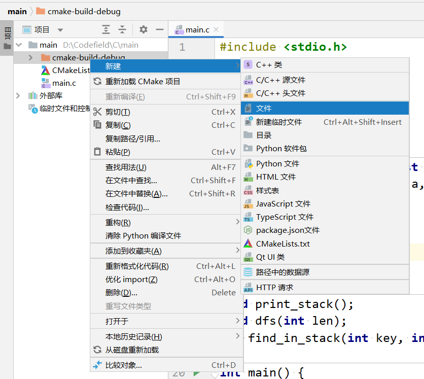 cmake-build-debug文件夹,新建 -> 文件,命名为a.in,再新建一个命名a.out。